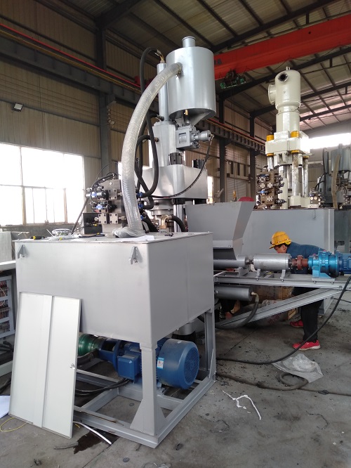 本设备液压系统由油箱、电机、油泵、组合阀、换向阀、压力表、液位计、高压胶管、温度计、回油滤油器、冷却器等组成,油液经油泵管路、液压元件进入液压油缸,由液压元件控制油缸的动作,实现挤压回复出饼等动作,系统压力由溢流阀调定,全自动机械动作由电脑控制,自动运行。主缸将饼块压实后压力继电器发讯,然后执行下一个动作,油箱内油温由冷却器调节,油温过高时,开大阀门,加大水量和循环速度,强行冷却,反之,关闭阀门。